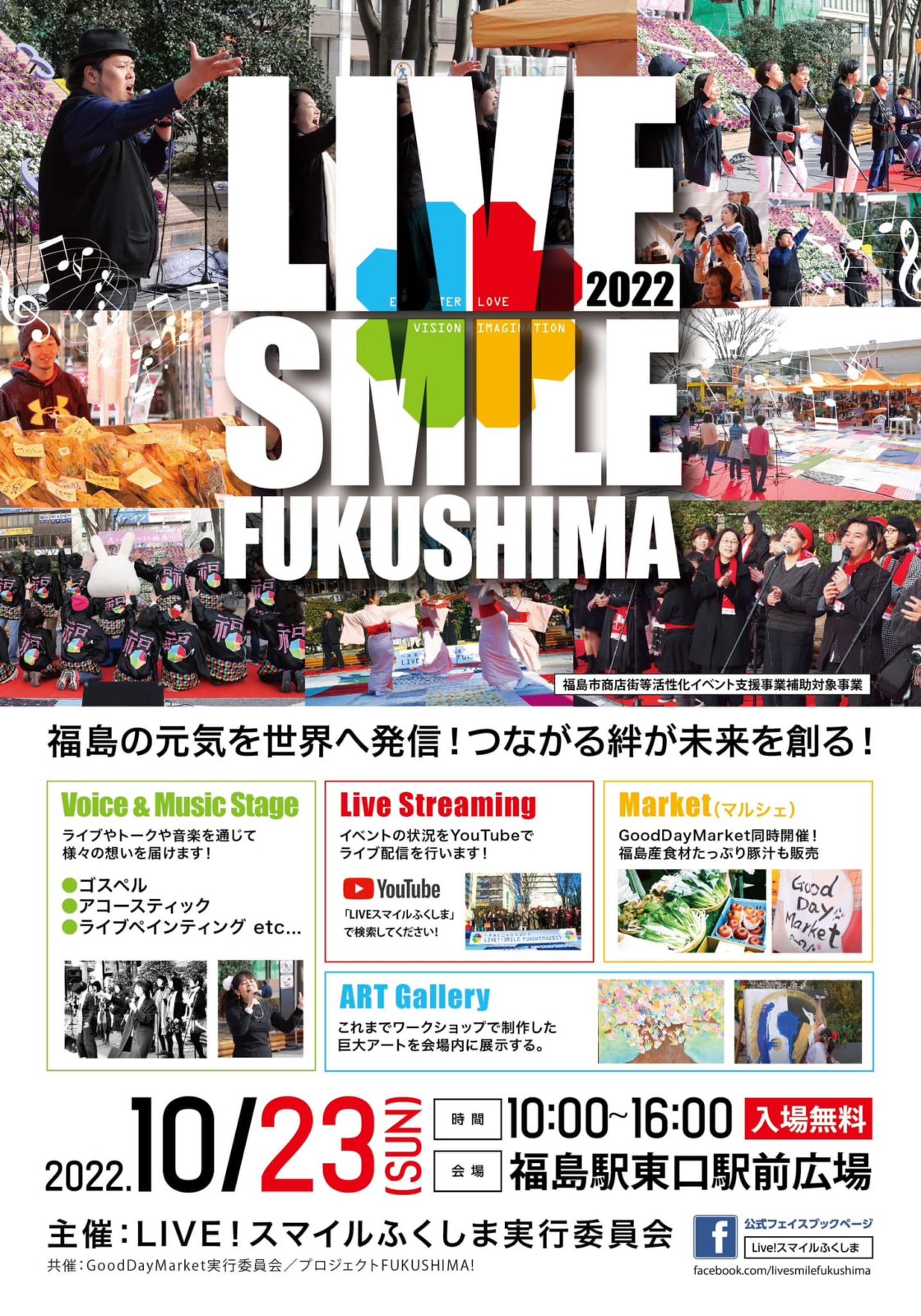 LIVE!スマイルふくしま 2022 UPDATE : 2022.10.22 BACK TO INDEX 2022.10.23 sun 10:00 – 16:00 入場無料 福島駅前に大風呂敷を広げます! スケジュールなどの詳細は 公式facebookページ をご覧ください! 主催 LIVE!スマイルふくしま実行委員会 前の記事へ BACK TO INDEX 次の記事へ