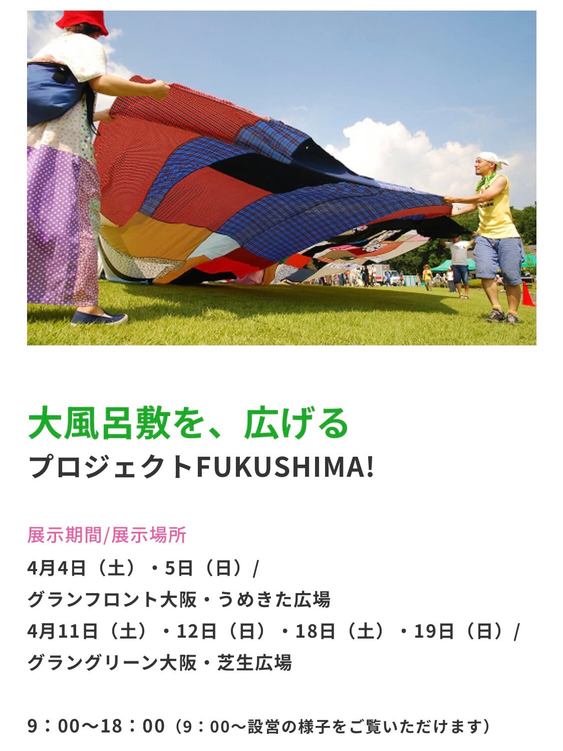 プロジェクトFUKUSHIMA!は会期中の全ての土日に登場します(4/3-4, 10-11, 17-18、各日9:00〜18:00 ※雨の場合は中止)。